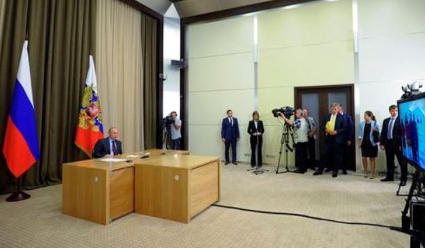 This weekend Russia announced that the world’s most northerly oil well was about to spud. Vladimir Putin did the actual announcing himself from his summer vacation palace in Sochi. (He is the guy behind the big desk, above.) He was linked by satellite to his friend Igor Sechin, head of Rosneft, and Exxon’s Glenn Waller, whose company is a joint-venture partner and is doing the actual drilling. (Those gentlemen were on the screen at the right, above.)