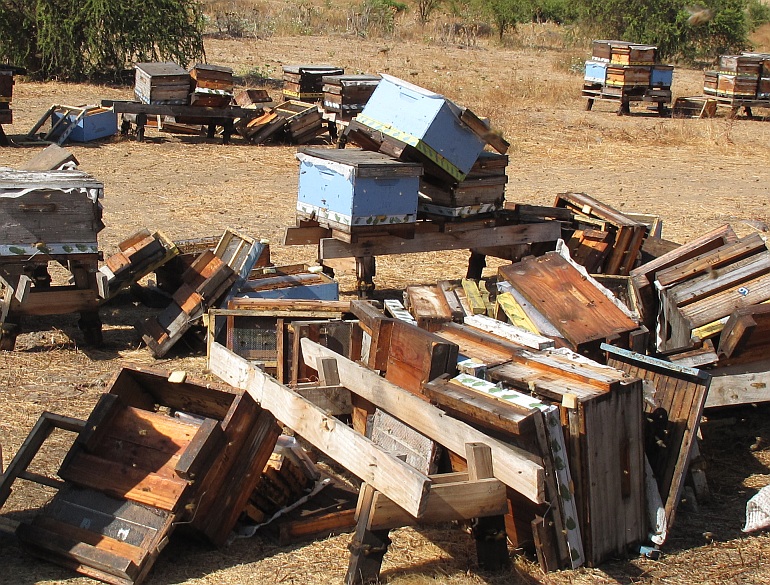 I missed the devastating 2010 Chilean earthquake by a few days. Considered the world’s 6th most powerful earthquake (in recorded history), it rivaled the world’s worst – which was in 1960 and also in Chile. In the picture above, you can see what happened to a friend’s honey bees hives. His farm was 500 kilometres from the epicentre. I saw this apiary a couple of weeks before the big earthquake. It was doing fine then. Funny thing about earthquakes. Everyone knows a bad one is coming. No one knows exactly when. But they can turn lives upside-down – human and arthropodal.