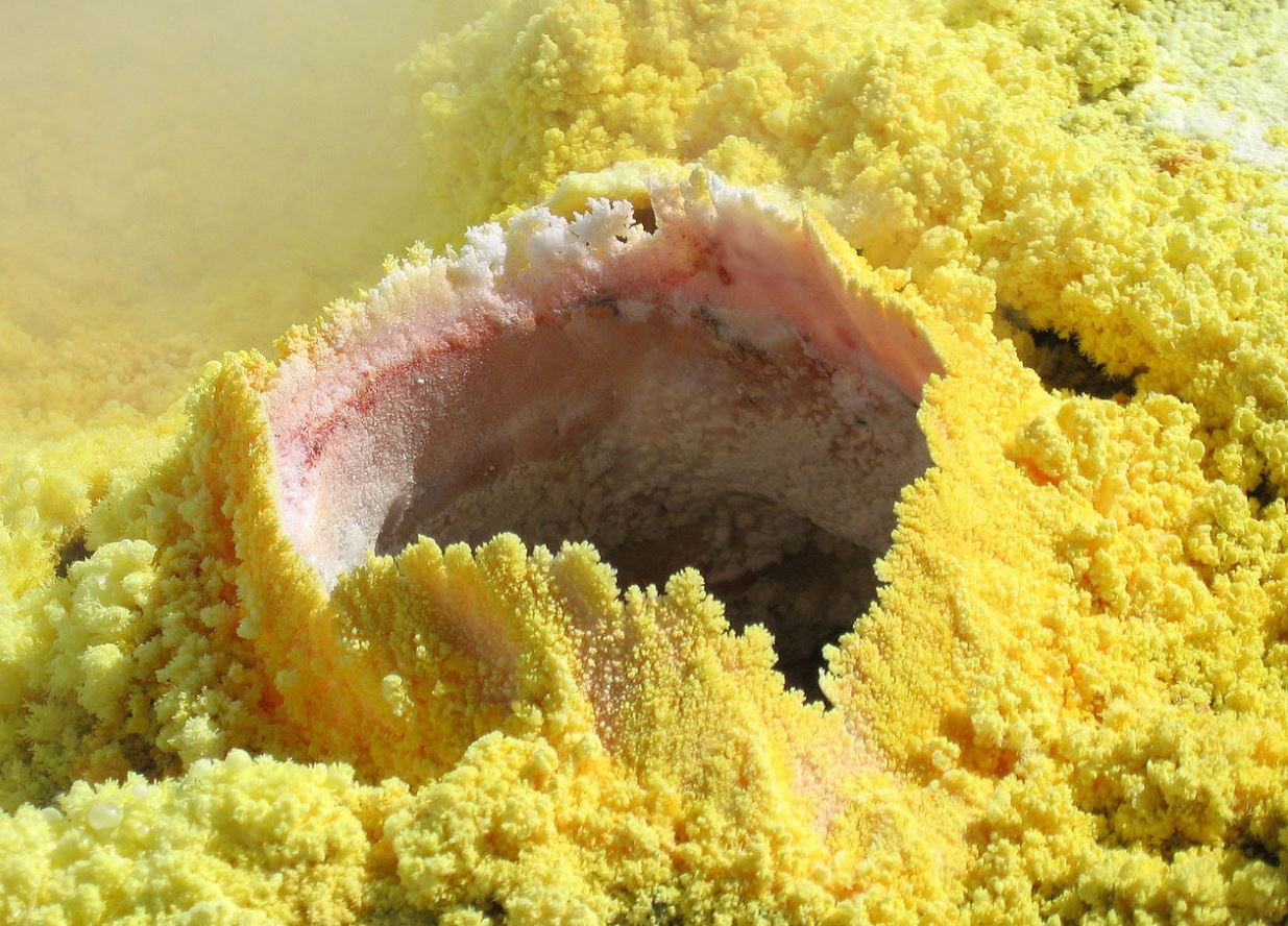 Well, sulphur is pretty universal. Astrophysicists figure it is cooked up in the deeper ovens of the larger stars. Or anywhere that temperatures exceed 2 billion degrees and pressure is sufficient to fuse silicon and helium into elemental sulphur. Once formed, expelled, and extruded into nascent solar systems, naturally occurring sulphur seems tame – yellowish and often crystalline. At its most pleasant, it looks like the sample in the picture on this page. If there
