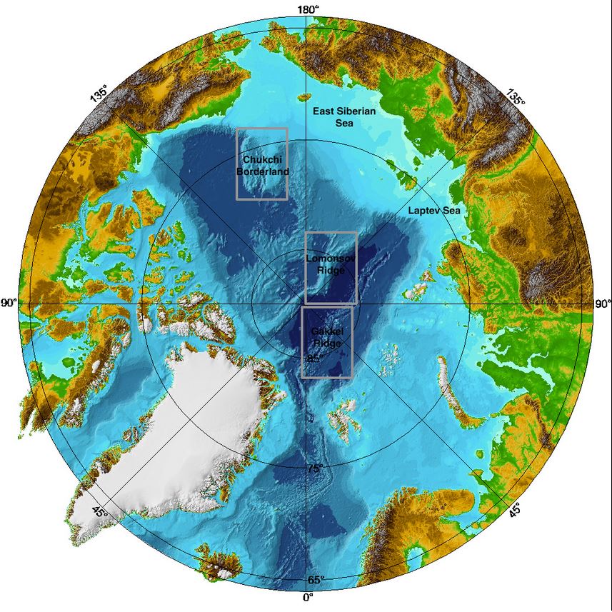 The Lomonsov Ridge is near the centre, crosses the North Pole, and extends to Greenland. From this single view, it is seen terminating at the boundary between Greenland and Canada but is detached from Russia. Image from NOAA Commons.