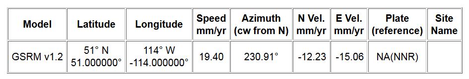 On the page at the end of this link, you will find a rather complicated-looking form that lets you type in your latitude, longitude, elevation and much, much more. There are actually 25 fields in which you may enter data, but I ignored almost all of them. You can see in the image above that I simply input my Calgary latitude and longitude (51 N and 114 W, which needs entered as minus 114 to designate the western hemisphere). The database returned the drift of my house. Calgary seems to be averaging 1.940 cm/year, in a southwestern direction. This is slower than most places on the planet, which surely explains why Calgary is famous for its lack of vertigo epidemics. The velocity from UNAVCO’s website is shown to you in a table, or in a download file, if you prefer. You can see my results here:
