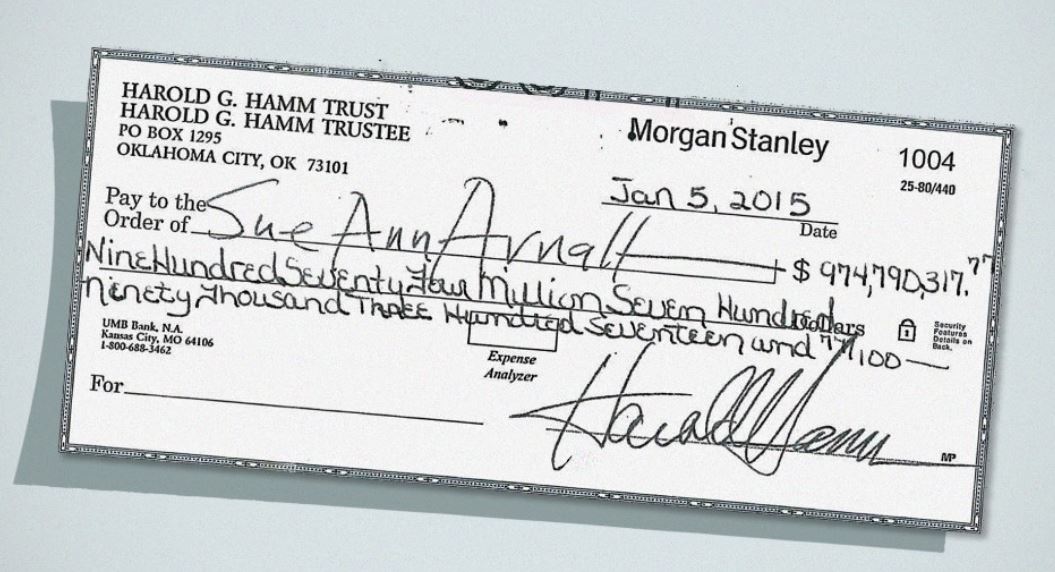Cheque Number 1004 from the Harold G. Hamm Trust to his ex-wife, for $974,790,317.77.